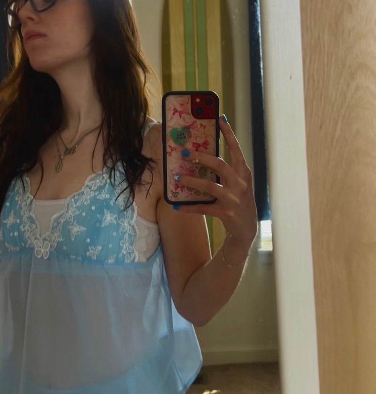 Moving on to this cute blue chiffon PJ set! It came with matching shorts to be worn as loungewear, but you could totally layer the top with a variety of pieces for daytime looks or nights out. I just love the lace trim and butterfly accents!