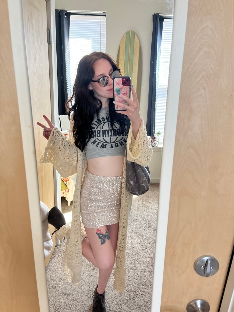 Next up we have this beachy kimono! Can’t wait to build some Coachella-inspired outfits like this one! (I’ve literally never been to Coachella lol I just have a Tumblr account lol) The sequin skirt keeps the outfit exciting through texture, and I couldn’t resist the biblically-accurate booties. Literally bury me in this outfit ok thx.
